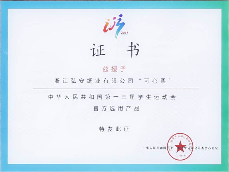 2017年9月4日中华人民共和国第十三届学生运动会在浙江杭州举行,可心柔携手中国邮政、中国平安、娃哈哈、京东校园、吉利汽车等知名企业品牌亮相大会。作为本次大会的12家合作单位之一,浙江九游网页版登录入口-九游(中国)纸业有限公司参加了发布会,并接受了官方选用产品的授牌。